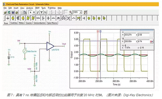 通過(guò)背板和電纜傳輸?shù)臅r(shí)鐘信號(hào)會(huì)因帶寬限制、碼間干擾 (ISI)、噪聲、反射和串?dāng)_導(dǎo)致性能下降。比較器可用于恢復(fù)時(shí)鐘信號(hào)并將其恢復(fù)為更清晰定義的形式(圖 7)。
