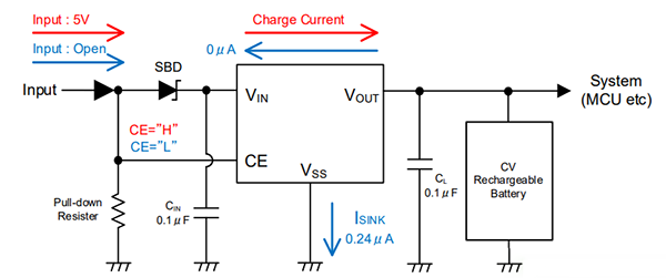 充電用調(diào)整器IC可對(duì)應(yīng)2.3V鋰二次電池的充電電壓的電壓要求,即使考慮到偏差,也可以輸出不超過(guò)二次電池的上限充電電壓。還可將從不充電時(shí)的二次電池流到充電IC的吸收電流(sink current)抑制得很小,大大有助于延長(zhǎng)電池驅(qū)動(dòng)時(shí)間。