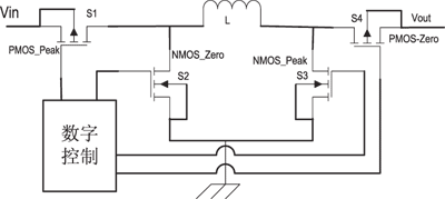 電感式結(jié)構(gòu)的主要貯能元件是電感,輸出電壓可以通過控制一個周期內(nèi)的充放電的占空比,來達到線性調(diào)節(jié),圖7所示為一個能夠自適應(yīng)實現(xiàn)升壓或降壓的拓撲結(jié)構(gòu),它的工作原理是:(1)S1和S3閉合,升壓模式,電感兩端的電壓等于輸入電壓;(2)S1和S4閉合,前向?qū)J,電感兩端的電壓等于輸入電壓減去輸出電壓;(3)S2和S4閉合,降壓模式,電感兩端的電壓等于反向輸出電壓。