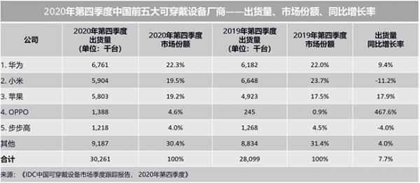 | 2020年Q4中國可穿戴設(shè)備市場份額排行:華為、小米、蘋果、OPPO、步步高前五 |