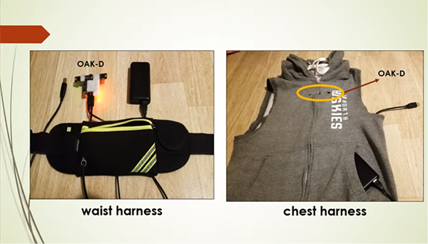 這個系統(tǒng)位于一個小巧的背包內(nèi),其中包含一個主機計算裝置,就像一個筆記本電腦。攝像頭隱藏在馬甲外套中,一個口袋大小的電池包放在腰包中,能夠提供使用大約8個小時的電力。一個Luxonis OAK-D空間人工智能攝像頭可以黏貼在馬甲或腰包上,然后連接到背包中的計算裝置。馬甲上有三個放置OAK-D攝像頭的小孔,而攝像頭則位于馬甲內(nèi)側。