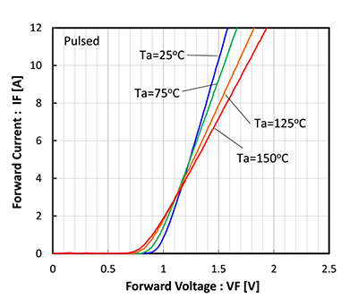 正向電壓VF(@ IF = 10A)低至1.5V,并且對(duì)開(kāi)關(guān)時(shí)功率損耗產(chǎn)生影響的恢復(fù)時(shí)間僅為10ns(@ VR = 400V),具有高性能二極管特性。這與硅快速恢復(fù)二極管相比,可以實(shí)現(xiàn)更快,更高效的工作。