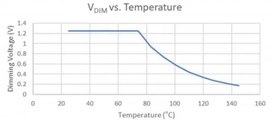 當器件處于70°C或更低溫度時,參考電壓提供的1.25V電壓會限制DIM輸入,并且LED會提供550 mA的電流。一旦溫度超過70°C閾值,電阻分壓器輸出就會降至1.25V以下。然后,DIM輸入遵循電阻分壓器配置文件,隨著溫度持續(xù)升高,這會減小LED驅(qū)動電流。