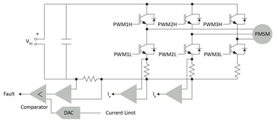 但是,要實現(xiàn)使用PMSM的優(yōu)勢,需要了解實現(xiàn)先進的FOC電機控制技術所固有的硬件復雜性,以及所需的領域專業(yè)知識。圖1顯示了使用三相電壓源逆變器的三相無傳感器PMSM控制系統(tǒng)?刂颇孀兤餍枰龑ο嗷リP聯(lián)的高分辨率PWM信號,以及大量需要信號調理的模擬反饋信號。該系統(tǒng)還需要具有容錯的硬件保護功能,該功能使用高速模擬比較器進行設計以實現(xiàn)快速響應。感測、控制和保護所需的這些額外的模擬組件會增加解決方案成本,典型的BDC電機設計或ACIM的控制不需要這些。
