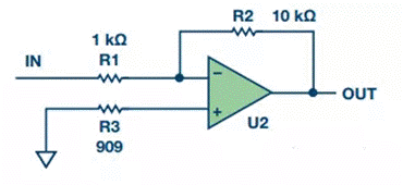 電阻熱噪聲的計(jì)算公式為√4kTRB,故1 kΩ電阻會(huì)有4 nV/√Hz的噪聲。增加電阻會(huì)增加噪聲。圖2中,出人意料的是,雖然909 Ω補(bǔ)償電阻是值最低的電阻,但由于從該節(jié)點(diǎn)到輸出端的噪聲增益,它給圖2輸出端貢獻(xiàn)的噪聲最多。R1引起的輸出噪聲為40 nV/√Hz,R2為12.6 nV/√Hz,R3為42 nV/√Hz。因此,請(qǐng)勿使用電阻。另一方面,如果運(yùn)算放大器采用雙電源供電,并且一個(gè)電源先于另一個(gè)電源上電,那么ESD網(wǎng)絡(luò)可能發(fā)生閂鎖問題。這種情況下,可能希望增加一定的電阻來保護(hù)器件。但若使用的話,應(yīng)在電阻上放置一個(gè)旁路電容以減少電阻的噪聲貢獻(xiàn)。