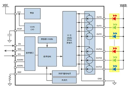 • 高分辨率脈沖寬度調(diào)制(PWM)控制,用于改變LED的亮度,但又不會過于有臺階變化的視覺感受。