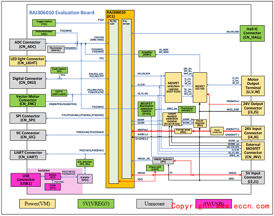 RAJ306010 is initially equipped with a sample code for 120 conduction control using a Hall IC, and a basicevaluation of motor control can be performed simply by connecting a 24V DC power supply and the attachedmotor. In addition, it is possible to connect and evaluate a motor and MOSFET prepared by user.