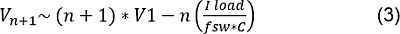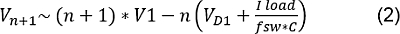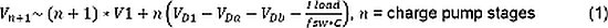 在公式(1)中,可以看出Vn+1很大程度上由n的倍數(shù)決定,但受到二級管正向壓降相關(guān)的“誤差項(xiàng)”和電荷泵轉(zhuǎn)換電容紋波電壓的影響,會有所減少。假設(shè)所有二極管都是相同類型的,那么它們的正向電壓等于: