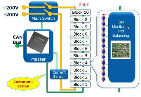 鋰電池儲能能力強,但單個電池的電壓和電流都太低,不足以滿足混合動力電機的需要。為增加電流需將多個電池并聯(lián)起來,為獲得更高的電壓,則要把多個電池串聯(lián)起來。單個鋰電池的電壓一般介于3.3~3.6V之間。例如,將多達12 個電池串聯(lián)組成一個電池塊(block)輸出電壓介于30~45V 之間,而混合動力汽車驅(qū)動需要336V左右的直流電源電壓,因此通常需要8-10個電池塊(block)串聯(lián)起來使用,意味著電動汽車的電池組是數(shù)量眾多的的單體電池組成(100節(jié)以上)。