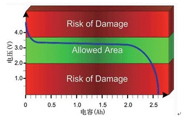 電池一旦電壓超出允許范圍,鋰電池很容易被損壞(見圖1.1.3)。如果超出電壓的上限和下限(例如,nanophosphate鋰電池的電壓上限和下限分別為3.6V和2V),電池就可能會受到不可逆的損壞,至少也會增加電池的自放電率。在相當寬的荷電狀態(tài)范圍內(nèi),輸出電壓可以保持穩(wěn)定,因此正常情況下超出安全范圍的可能性比較小。但是,在接近安全范圍上限和下限的區(qū)域,變化曲線非常陡峭。作為預防措施,仔細監(jiān)測電壓水平非常必要。