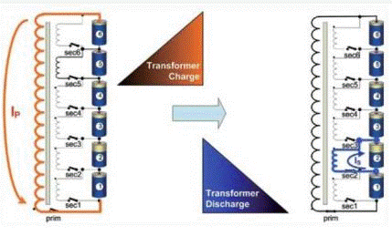 如圖2.3所示,閉合其中一個電池組的電子開關(guān)SP1 和SP2,就可以對最左邊的繞組的初級進行充電,之后關(guān)閉SP1和SP2,就可以把能量放入總電池組中。這樣就可以實現(xiàn)更多電池單體的串聯(lián)。