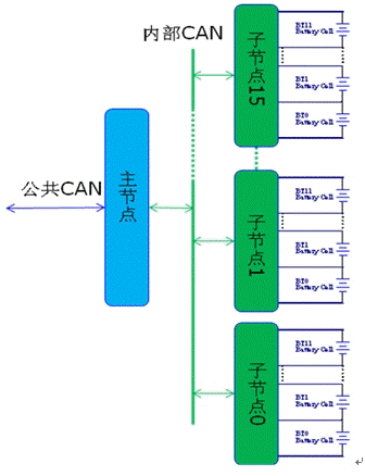 電池管理系統(tǒng)采用獨立的內(nèi)部CAN總線進行數(shù)據(jù)和指令傳輸,每個內(nèi)部CAN總線子節(jié)點電路和最大12節(jié)串聯(lián)電池單元相連,組成電池包。各個電池包串聯(lián)組成電動汽車所需的電池總成。主節(jié)點采用汽車級16位單片機XC2267連接內(nèi)部CAN網(wǎng)絡,同時接入電動汽車上的公共CAN網(wǎng)絡,收發(fā)相關(guān)的指令和數(shù)據(jù)。見圖3.1.1