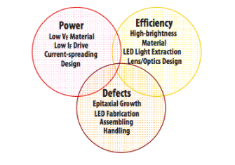 如圖2所示,LED可靠性在各個(gè)領(lǐng)域都取得了長(zhǎng)足的進(jìn)步。更高的LED內(nèi)部量子效率,更好的LED光提取以及光通道效率的提高,使得能夠降低輸入驅(qū)動(dòng)電流(IF)的要求。通過(guò)設(shè)計(jì)低正向電壓(VF)LED,Avago可以降低輸入功率(IF x VF),以減少LED產(chǎn)生的熱量。良好的電流分布LED設(shè)計(jì)將改善LED內(nèi)的電流分布,從而進(jìn)一步改善固有壽命。