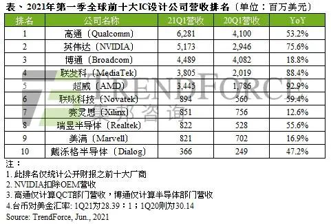 高通(Qualcomm)第一季手機(jī)部門,以及射頻前端、物聯(lián)網(wǎng)與車用部門皆有成長表現(xiàn),營收達(dá)62.8億美元,年成長53.2%,穩(wěn)居全球第一。而英偉達(dá)(NVIDIA)受惠于加密貨幣與宅經(jīng)濟(jì)帶動的市場需求,游戲顯卡部門成為推動整體營收的關(guān)鍵,加上數(shù)據(jù)中心部門也有一定程度的貢獻(xiàn),以51.7億美元的營收,超越博通(Broadcom)拿下第二名。