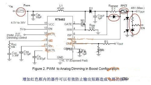 2:輸出短路時,受大電流沖擊的脆弱部件需要加強(圖中的Rsense )。