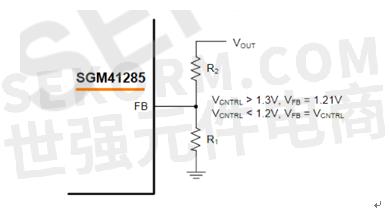 2、輸出電壓設(shè)置。SGM41285輸出電壓通過FB引腳與GND之間分壓電阻進(jìn)行設(shè)置,如圖2所示。R1(R1與GND之間)一般選擇 5 kΩ和10 kΩ之間,然后利用下式計算R2(Vout與FB之間):