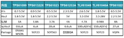主要推薦TPS61099跟TPS61322系列。其中TPS61099的靜態(tài)電流可以低至0.8uA,支持0.7V的超低壓輸入。另外一顆TPS61322X系列是固定輸出,電流也比TPS61099稍微大一點,對功耗不是特別嚴苛的可以選擇這顆6uA的升壓芯片。這2顆升壓芯片都支持輕載高效,1mA的負載效率都在90%以上。如需更大的電流請看圖四推薦。