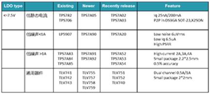 美容儀和保健按摩儀上的線性穩(wěn)壓器分4個類型:超低靜態(tài)電流的,低噪聲電流小于1A的,低噪聲電流大于1A的和通用LDO。下面的表格從時間上區(qū)分了不同類型的LDO,左邊的是早期一點的LDO,中間的是最近幾年推出的LDO,右邊的是2021年左右推出的LDO,可以根據(jù)不同的需求選擇LDO。