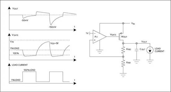 負(fù)載快速變化期間,多數(shù)穩(wěn)壓器都具備一定的能力使輸出保持在穩(wěn)壓范圍內(nèi)。負(fù)載變化時(shí),輸出FET柵極驅(qū)動(dòng)需要隨之變化。而柵極驅(qū)動(dòng)達(dá)到新水平所需的時(shí)間決定了輸出電壓的瞬態(tài)下沖或過(guò)沖。