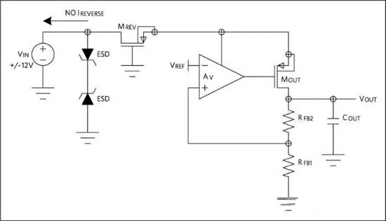 反向電壓保護(hù)允許輸入引腳電壓低于地電位,不會(huì)吸收顯著電流。為達(dá)到這一目的,需要通過(guò)串聯(lián)開關(guān)將輸出FET的體二極管斷開。大多數(shù)穩(wěn)壓器都包括二極管,防止任何引腳電壓低于地電位,防止引腳發(fā)生靜電放電,即ESD。為實(shí)現(xiàn)反向電壓保護(hù),也需要去除該二極管的影響,并采取不同的保護(hù)器件,參見(圖6)。