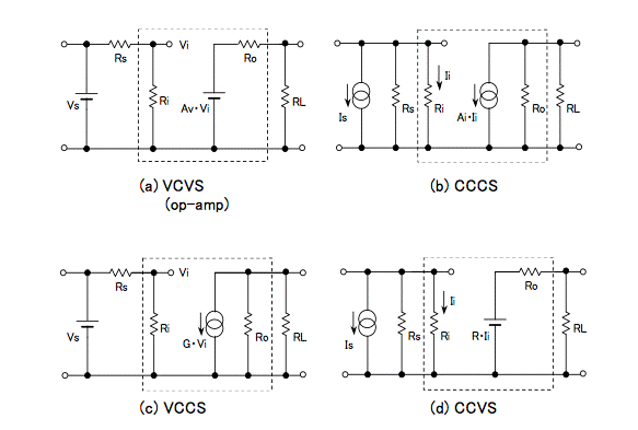 上述四種類型所需的功能是在不衰減的情況下檢測(cè)和放大輸入信號(hào),并在不衰減負(fù)載的情況下提供輸出信號(hào)。我們將通過(guò)對(duì)輸入信號(hào)源、放大器和負(fù)載進(jìn)行建模來(lái)考慮放大器所需的功能。圖 1 (a) – (d) 顯示了上述四個(gè)放大器的模型,包括輸入信號(hào)源和負(fù)載。圖1(a)所示為壓控電壓源模型。該放大器的輸入電阻用 Ri 表示,輸出電阻用 Ro 表示,放大系數(shù)用 Av 表示。輸入信號(hào)源由電壓源 Vs、輸出電阻 Rs 和負(fù)載 RL 建模。使用這些模型,通過(guò)以下等式計(jì)算輸出電壓: