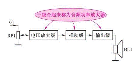 圖2-26所示是音頻功率放大器電路組成方框圖。這是一個多級放大器,由前面的電壓放大級、中間的推動級和后的功放輸出級共三級電路組成。