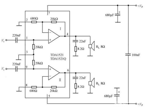 圖中,Vi是信號的輸入端,兩個Vi分別接左右兩個聲道的兩路信號。左側(cè)方框內(nèi)為TDA1521芯片的內(nèi)部原理結(jié)構(gòu)。整個功率放大電路的外接元件僅僅為兩個電阻和幾個電容,可見,使用TDA1521搭建功率放大電路是非常簡單的。