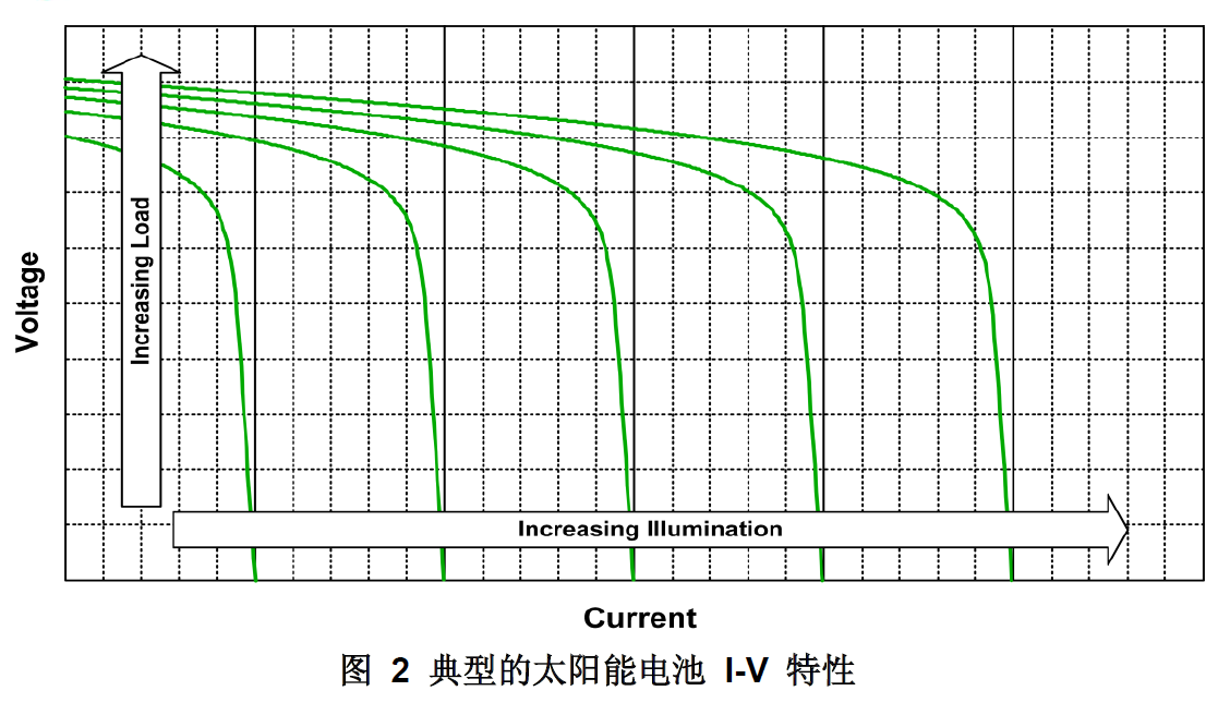 電流源IPH會(huì)產(chǎn)生一個(gè)和太陽(yáng)能電池上的光量度成正比的電流。在沒(méi)有負(fù)載連接的情況下,幾乎所有產(chǎn)生的電流均流經(jīng)二極管D1,其正向電壓決定了太陽(yáng)能電池的開(kāi)路電壓(VOC)。該電壓會(huì)因不同類(lèi)型太陽(yáng)能電池的特性不同而有所差異,但是,對(duì)于大多數(shù)硅電池而言,這一電壓都在0.5V~0.6V之間(這也是p-n結(jié)二極管的標(biāo)準(zhǔn)正向電壓)。在實(shí)際太陽(yáng)能電池應(yīng)用中,并聯(lián)電阻RP的漏電流很小。隨著負(fù)載電流的增加,IPH產(chǎn)生的大部分電流從二極管中流出來(lái)并進(jìn)入負(fù)載。對(duì)于大多數(shù)負(fù)載電流而言,這個(gè)過(guò)程對(duì)于輸出電壓僅有很小的影響。由于二極管的I-V特性會(huì)有輕微的變化,并且由于串聯(lián)電阻RS的原因(其具有連接損耗)電壓會(huì)稍有下降,但輸出電壓卻保持大體恒定。然而,有時(shí)流經(jīng)D1的電流太小,從而導(dǎo)致二極管偏置不夠,并且二極管兩端的電壓會(huì)隨著負(fù)載電流的增加而急劇下降。最后,如果所有產(chǎn)生的電流均只流經(jīng)負(fù)載(而不流經(jīng)二極管),則輸出電壓就會(huì)變?yōu)榱。這個(gè)電流被稱(chēng)為太陽(yáng)能電池的短路電流(ISC)。ISC和VOC都是定義太陽(yáng)能電池工作性能的主要參數(shù)之一。