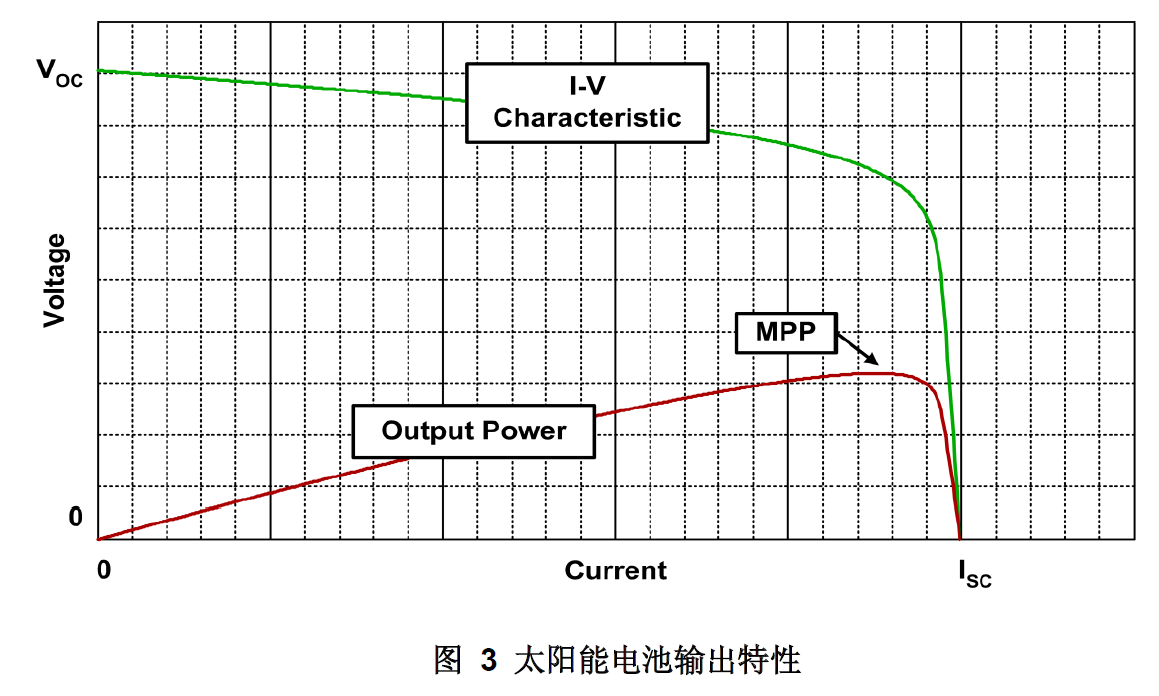 在大多數(shù)應(yīng)用中,人們都期望太陽(yáng)能電池能提供盡可能多的電能。由于輸出功率是輸出電壓和電流的乘積,因此就必須確定電池工作區(qū)域中的哪一部分所產(chǎn)生的VI值最大。這一點(diǎn)被稱(chēng)為最大功率點(diǎn)(MPP)。當(dāng)輸出電壓為其最大數(shù)值(VOC)時(shí),輸出電流為零,這是一個(gè)極端情況;而當(dāng)輸出電流達(dá)到最大值(ISC),但輸出電壓為零時(shí),則是另一種極端情況。在這兩種情況下VI的乘積均為零,因此,這兩種極端情況肯定都不是MMP點(diǎn)。我們可以很容易證明(或通過(guò)實(shí)驗(yàn)進(jìn)行觀察),在任何應(yīng)用中,MPP一般會(huì)出現(xiàn)在太陽(yáng)能電池輸出特性(請(qǐng)參見(jiàn)圖3)下半部分的某個(gè)位置。但問(wèn)題是太陽(yáng)能電池MPP的確切位置會(huì)因入射光線和環(huán)境溫度不同而變化。所以,設(shè)計(jì)旨在動(dòng)態(tài)地調(diào)節(jié)太陽(yáng)能電池的輸出電流,以達(dá)到太陽(yáng)能電量生成系統(tǒng)的最大化,以便在實(shí)際應(yīng)用中其能夠在MPP點(diǎn)或者其臨近點(diǎn)工作。