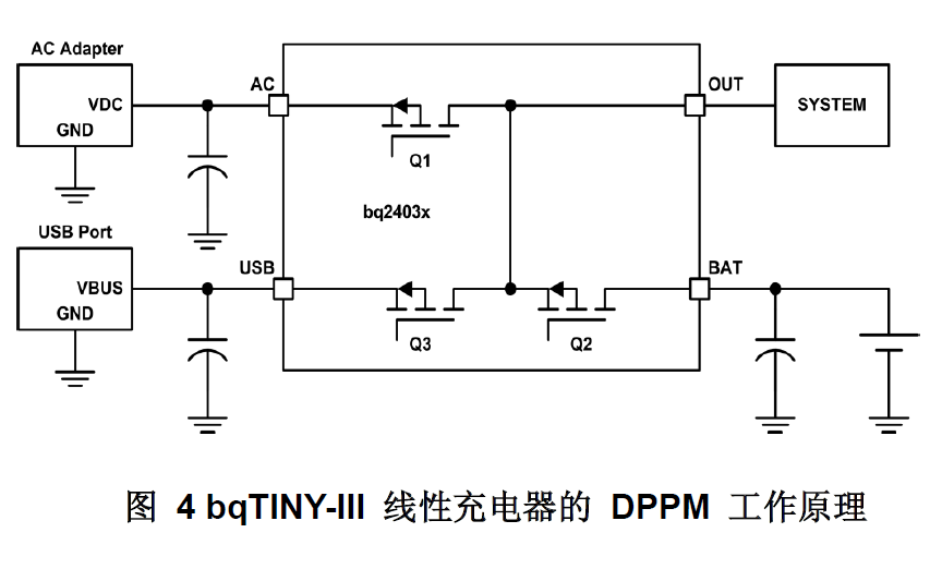 實(shí)施這一方案(最大功率點(diǎn)跟蹤器)的方法有很多,但都非常復(fù)雜,尤其是在衛(wèi)星等任務(wù)關(guān)鍵型系統(tǒng)中。然而,在很多小型應(yīng)用中,并不需要極其精確的MPP跟蹤方案,只需要一個(gè)能利用率約90%-95%可用電能的簡(jiǎn)單低成本解決方案即可。TI線性充電控制器bqTINY-III系列的動(dòng)態(tài)電源路徑管理(DPPM)功能就可用于諸如簡(jiǎn)化MPP跟蹤器的實(shí)施。DPPM功能的主要原理如圖4所示。暫時(shí)忽略USB輸入,電路的工作原理如下:Q1對(duì)OUT引腳的電壓進(jìn)行調(diào)節(jié),Q2根據(jù)一個(gè)典型的CC-CV鋰離子充電曲線對(duì)充電電流進(jìn)行調(diào)節(jié)。如果連接至AC引腳的電源電流不足而無(wú)法為系統(tǒng)供電并為電池充電,則VOUT開(kāi)始下降。如果VOUT達(dá)到了預(yù)定義的閾值VDPPM,bqTINY-III則會(huì)自動(dòng)將充電電流降至一個(gè)可保持VDPPM時(shí)VOUT的水平。