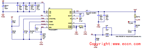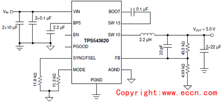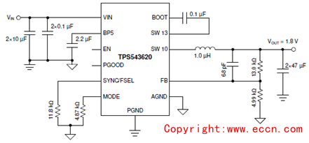 圖5. TPS543620應(yīng)用電路:12V輸入,1.8V輸出,1MHz