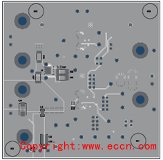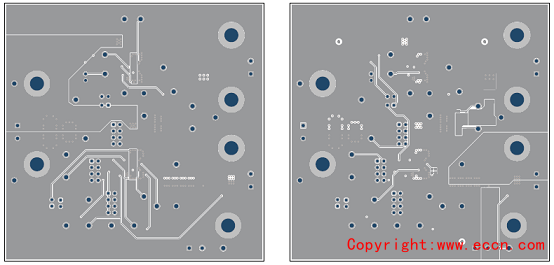 圖11.評(píng)估模塊TPS543620EVM PCB設(shè)計(jì)圖:左:中2層布局;右:底層布局