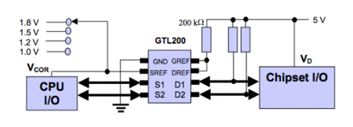 對(duì)于雙向轉(zhuǎn)換,GTL-TVC設(shè)備兩側(cè)的驅(qū)動(dòng)器必須是開漏輸出,或者至少必須以這樣的方式控制它們:一側(cè)的輸出驅(qū)動(dòng)器上的高電平與低電平之間的爭(zhēng)用防止另一側(cè)的輸出驅(qū)動(dòng)器上的電壓過高。最簡(jiǎn)單的解決方案是使用漏極開路設(shè)備(標(biāo)準(zhǔn)GTL和I2 C / SMBus輸出是漏極開路輸出)。