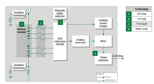 我們已經(jīng)討論了具有高額定電壓的主保險(xiǎn)絲模塊的輸出。每個(gè)單獨(dú)的電池包也應(yīng)該融合。低壓熔斷器可用于此目的。每個(gè)模塊都有自己的微處理器來(lái)監(jiān)控電池狀態(tài)并將其報(bào)告給主控制器。因此,有線(xiàn)接口應(yīng)使用 TVS 二極管陣列來(lái)保護(hù) CAN 總線(xiàn)。