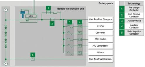 典型的 EV 能量存儲(chǔ)系統(tǒng)由電池組、大功率電流中斷元件、電池控制電路和將電池狀態(tài)傳輸?shù)街鬈?chē)輛處理器的通信電路組成。