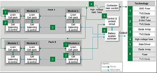 簡(jiǎn)而言之,電動(dòng)汽車(chē)電池組架構(gòu)的復(fù)雜性表明需要多級(jí)電路保護(hù)。在模塊級(jí)別,整個(gè)模塊和單個(gè)電池需要過(guò)流和過(guò)載保護(hù)。監(jiān)測(cè)和控制電子設(shè)備應(yīng)加強(qiáng)瞬態(tài)電壓保護(hù)。 CAN 數(shù)據(jù)線(xiàn)應(yīng)具有 ESD 和電壓瞬變保護(hù),以確保電池組與主要車(chē)輛微處理器之間的通信不受干擾。結(jié)合這些保護(hù)拓?fù)溆兄谙姵亟M故障的發(fā)生。 |