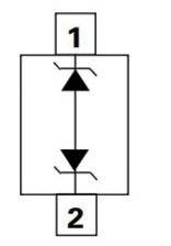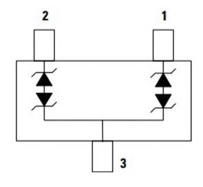 雙向保護(hù) ESD 二極管的示例示意圖,由兩個(gè)陽(yáng)極到陽(yáng)極連接的 TVS 二極管組成。 (參考:AQxxC-01FTG TVS 二極管陣列)