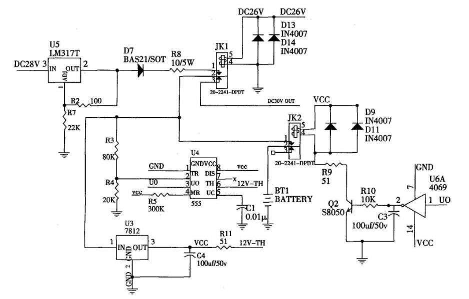 這個電路的結構比較簡單,使用一個片常用的電壓比較器芯片-LM393。這是一個雙電壓比較器芯片,在這個電路中使用了其中的一片。這個電路的工作原理是:蓄電池除了給負載部分供電外,還會給這個電路提供電源。電壓比較器的同相輸入端由電阻R2通過穩(wěn)壓二極管穩(wěn)壓,經(jīng)過電阻R3提供基準電壓,同時蓄電池電壓會經(jīng)過電阻R1以及可變電阻VR1的分壓輸入到電壓比較器的反相輸入端,這一路作為電池電壓的檢測,通過調(diào)節(jié)VR1使電壓在放電保護電壓。正常工作時,反相輸入端的電壓會高于同相輸入端,比較器的輸出端會輸出低電平,驅動外接的PNP三極管導通,繼電器線圈得電工作,常開觸點閉合,蓄電池會給負載供電。
