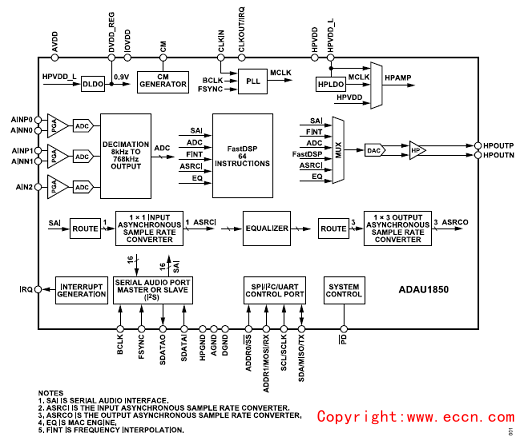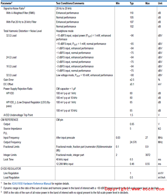 ADI公司的ADAU1850是具有三個(gè)輸入和一個(gè)輸出的集成了數(shù)字信號(hào)處理器的編譯碼器(CODEC).從模擬輸入到DSP核到模擬輸出的通路經(jīng)過(guò)優(yōu)化,具有低等待時(shí)間,非常適合于降噪音耳機(jī)使用.只需要增加少許無(wú)源元件, ADAU1850提供了完整的耳機(jī)解決方案. ADAU1850具有可編程的FastDSP音頻處理引擎,高達(dá)768kHz取樣速率,具有Biquad濾波器,限幅器,音量控制和混合等功能,低等待時(shí)間的24位ADC和DAC,106dB SNR(信號(hào)通過(guò)ADC和A加權(quán)濾波器),串口取樣速率從8kHz到768kHz,模擬到模擬群時(shí)延為5 μs,可編程雙精度MAC引擎用于13級(jí)均衡器,3個(gè)模擬輸入(2個(gè)差分和一個(gè)單端),可配置成麥克風(fēng)或線輸入.模擬差分風(fēng)音頻輸出,可配置成線路輸出或耳機(jī)驅(qū)動(dòng)器,PLL支持30 kHz到27 MHz的任何輸入時(shí)鐘,1路ASRCI,三路ASRCO,串行音頻端口支持I2S,左對(duì)齊,或高達(dá)16路TDM (TDM16),具有靈活路經(jīng)的兩個(gè)插值器和4個(gè)抽取器.模擬AVDD電源電壓為1.8V.數(shù)字I/O IOVDD電壓為1.8V到3.3V.通信接口為I2C,SPI和UART.采用28點(diǎn)0.4mm間隔2.957 mm × 1.757 mm WLCSP封裝.主要用在降噪手機(jī)和耳機(jī),藍(lán)牙有源降噪(ANC)手機(jī)和耳機(jī),PND,數(shù)字照相機(jī)和攝影機(jī),樂(lè)器效果處理器,多媒體揚(yáng)聲器系統(tǒng)和智能手機(jī).本文介紹了ADAU1850主要特性,功能框圖和模擬性能指標(biāo),以及評(píng)估板EVALADAU1850EBZ主要特性,框圖,電路圖和材料清單.