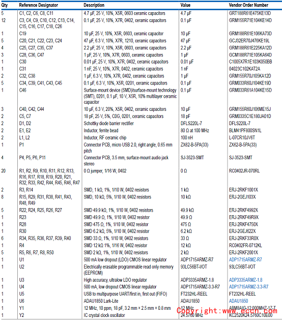 評(píng)估板EVALADAU1850EBZ材料清單: