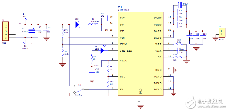ANT2801內(nèi)部充電管理部分采用一套完整可靠的充電機(jī)制。無(wú)論電池是否連接,都可以正常工作。而且無(wú)需外部補(bǔ)償來(lái)實(shí)現(xiàn)芯片的穩(wěn)定。在上電過(guò)程中,首先,VIN對(duì)VOUT充電,當(dāng)達(dá)到VIN時(shí),SW開始震蕩工作,實(shí)現(xiàn)升壓功能,當(dāng)VOUT建立好之后,才開始檢測(cè)VBATT狀態(tài)。