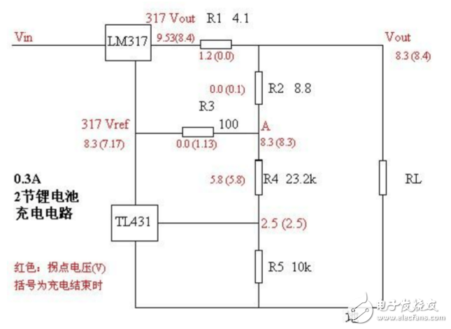 由LM317和R1、R2、R3組成一個(gè)典型的恒流電路(431暫時(shí)認(rèn)為斷開R4比較大可以先不看)。當(dāng)電壓不太高時(shí)保持恒定的充電電流。以兩節(jié)電池充電為例,理想狀態(tài)下,充電電流應(yīng)該是電壓達(dá)到8.3V前一直保持恒定。當(dāng)A點(diǎn)電壓達(dá)到拐點(diǎn)值8.3V時(shí),經(jīng)過(guò)R4、R5分壓,TL431開始導(dǎo)通,并把LM317的基準(zhǔn)點(diǎn)電壓從8.3V逐漸拉下。所謂拐點(diǎn)就是指電流開始下降的那點(diǎn)。直到電壓達(dá)到8.4V的0電流點(diǎn),A點(diǎn)仍然保持這個(gè)8.3V電壓,LM317的輸出Vout下降到8.4V,其調(diào)整端下降到7.17V。