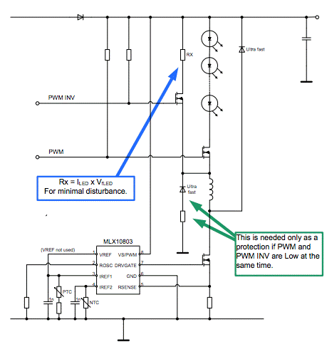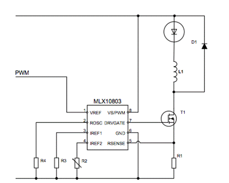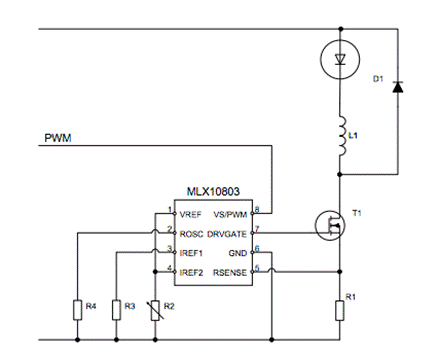創(chuàng)建LED電流的PWM調(diào)制的最直接方法是將PWM信號(hào)直接施加到MLX10803的電源。MLX10803電路具有非常快的上電時(shí)間,如果PWM信號(hào)具有以下某些給定的特性,則使用以下電路沒有問題。