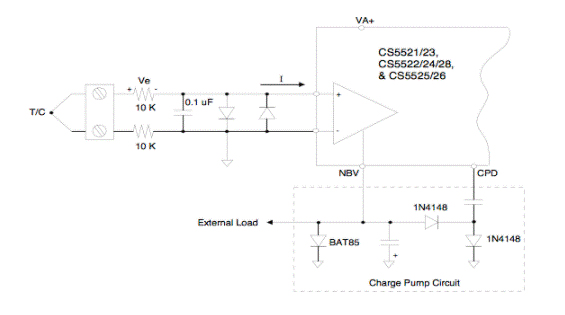 CS5521 / 23,CS5522 / 24/28和CS5525 / 26系列A / D轉(zhuǎn)換器包括一個(gè)斬波穩(wěn)定儀表放大器,用于測(cè)量低電平直流信號(hào)(±100 mV或更。。該放大器設(shè)計(jì)為產(chǎn)生非常低的輸入采樣電流(-40至+85 + C時(shí)ICVF <300 pA)。如圖1所示,當(dāng)使用高阻抗電路進(jìn)行輸入保護(hù)時(shí),低輸入電流可將熱電偶測(cè)量中可能發(fā)生的誤差減至最小。