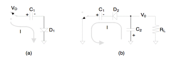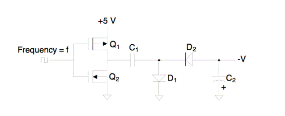 圖2說明了基本的二極管電荷泵。晶體管Q1和Q2代表CMOS反相器的輸出晶體管。當(dāng)反相器的輸入導(dǎo)致晶體管Q1導(dǎo)通(Q2截止)時(shí),C1通過二極管D1充電至大約5 V的電壓減去二極管的正向電壓。當(dāng)逆變器的輸出切換為Q1斷開,Q2接通時(shí),C1帶正電的導(dǎo)線將接地。由于電容器兩端的電壓不能瞬時(shí)改變,因此連接到二極管D2的C1的引線將變?yōu)樨?fù),從而導(dǎo)通二極管D2。C1上的電荷然后將流到C2上并產(chǎn)生負(fù)輸出電壓。電容器C2充當(dāng)電荷的儲(chǔ)存器,并且比電荷泵電容器C1大得多。在經(jīng)過數(shù)個(gè)電荷泵循環(huán)后,
