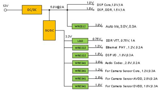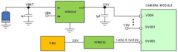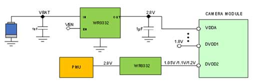 CMOS Image Sensor(圖像傳感器)需要三路電源(Core,Analog和I/O),其中2.8V為模擬電壓,1.8V為I/O數(shù)字電壓,1.2V為核電壓。此時,通過維安WR0332外置低壓差線性穩(wěn)壓器(LDO)為CMOS Image Sensor供電,可將集中在IC的熱量分散開,抑制整個電路的發(fā)熱量,實現(xiàn)高轉(zhuǎn)換效率,有助于進一步降低手機攝像頭模塊的功耗。特別是應用于 AVDD時,優(yōu)秀的紋波抑制能力1KHz@70dB ,還能顯著較少電源線干擾噪聲,為CMOS圖像傳感器穩(wěn)定供電。另外核電壓部分,維安還開發(fā)設計了1.0V~1.2V輸出的規(guī)格,可根據(jù)用戶的需求選擇不同的電壓給Core供電。
