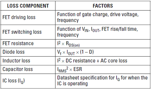 DC/DC轉(zhuǎn)換器的效率,是進行電源設(shè)計時需要考慮的最重要屬性之一。低效率會轉(zhuǎn)換成高功耗,必須要在印刷電路板(PCB)上使用單獨的散熱器或者更多的銅,才能處理這些功耗。功耗也對電源上游器件提出了更高的要求。如表3所示,功耗共有幾個組成部分。