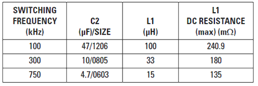 本例中,我們可以通過750-kHz開關(guān)頻率來產(chǎn)生一個5-V輸出電壓(參見表2)。但是,如果該頻率為1 MHz,則最低可能輸出電壓被限制為約6V;否則,DC/DC轉(zhuǎn)換器會跳過脈沖。替代方法是降低輸入電壓或者頻率。在選擇某個開關(guān)頻率以前,你最好是先查看DC/DC轉(zhuǎn)換器數(shù)據(jù)表,了解保證最小可控“導(dǎo)通”時間。
