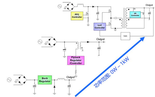 MPS可以提供0-1000W全系列的AC-DC電源解決方案,從1W輸出的智能LDO和Buck非隔離方案,到10W輸出的非隔離降壓方案,MPS均有集成功率管的解決方案。對于小功率隔離反激方案,MPS也有集成功率管和控制器的方案提供。最后到大功率的LLC方案,在75W輸出以上,比較常用的PFC+LLC架構(gòu),MPS有獨立的PFC控制器和LLC控制器提供。