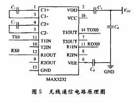 通過串口驅(qū)動電路中的RS 232電平轉(zhuǎn)換芯片,可以實現(xiàn)單片機和PC機之間的通信,建立人-機對話活動的通道。桑銳公司生產(chǎn)的SRWF-1型無線通信模塊工作性能穩(wěn)定,體積小便于安裝。利用MAX3232芯片,能夠完成TTL電平和RS 232電平之間的轉(zhuǎn)換,實現(xiàn)通信模塊與PC機進行串口通信。其電路原理圖如圖5所示。
